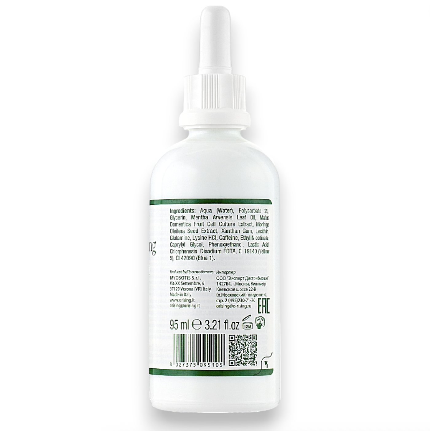 Skład INCI: Aqua, Poysorbate 20, Glycerin, Mentha Arvensis Oil, Malus Domestica Fruit Cell Culture Extract, Moringa Oleifera Seed Extract, Xanthan Gum, Lecithin, Glutamine, Lysine HCl, Caffeine, Ethyl Nicotinate, Caprylyl Glycol, Phenoxyethanol, Lactic Acid, Chlorphensin, Disodium EDTA, Cl 19140, Cl 42051.